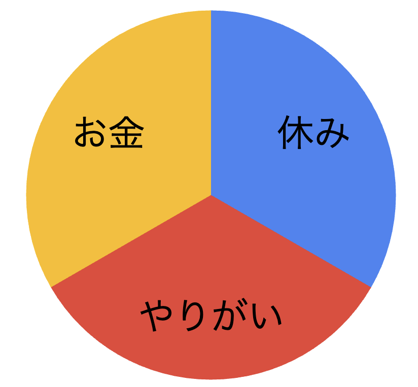 私も初めは「やりがい」を求めていたのですが、実際に仕事をやっていくにつて「休み」が自分の中で一番大切なことに気づきました。なので収入が良かったとしても休みがない仕事は絶対にやりたくないです。